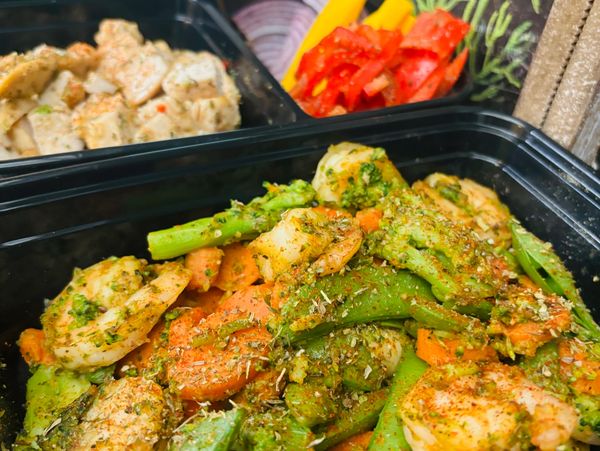 Highlighted in the front is my famous Chef Zaatovn Shrimp and Vegetable Stir Fry. Further in the picture is Cajun grilled chicken with raw veggies for a salad.